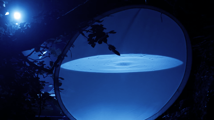 two main elements: sound and water. a 45-minute soundtrack is performed live in the riverbed. the water reacts to the sound, creating curves and movements that are reflected and projected onto a suspended white circle.